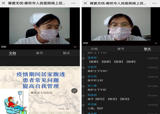 为提高尿毒症患者的生活质量和生存率,帮助尿毒症患者进行科学的病症防治和自我管理,5月16日,市人民医院肾内科举办了“腹膜透析”线上肾友会,廊坊区域肾脏患者通过在线收看直播的方式参与讨论交流。肾内科主任岳英丽、腹透专职护士高平线上答疑解惑,会议全程流畅活跃,肾友们倾心交谈,积极互动,气氛活跃。