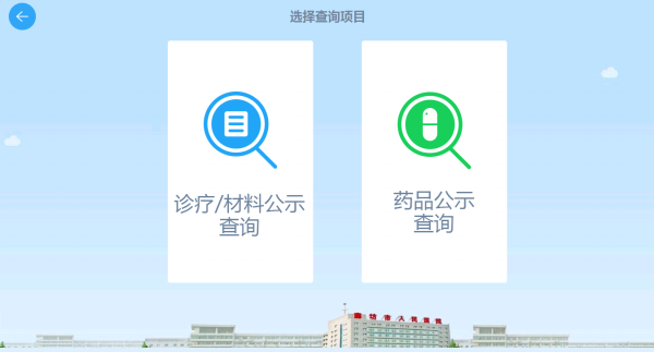 点击“综合查询”按钮,进入后,分别展示【诊疗/材料公示查询】和【药品公示查询】