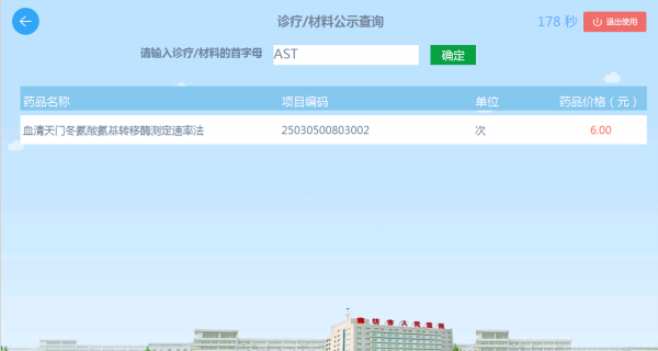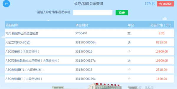 患者可通过上方搜索栏输入诊疗/材料的拼音首字母进行精确定位查询。展示公示内容,每隔两秒翻页一次