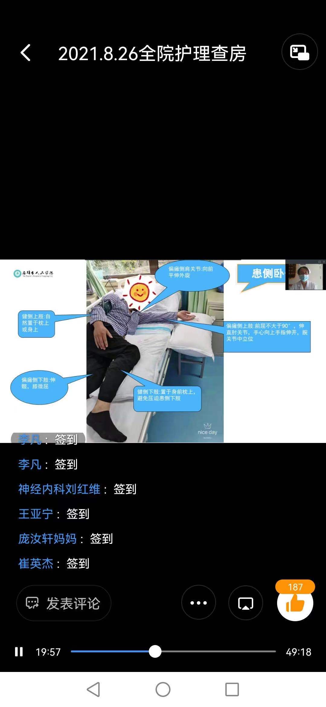 根据护理部的工作计划,第三季度全院护理业务查房在神经内科进行。由于疫情防控的要求,本次查房采用线上直播与现场相结合形式进行。主题为多发脑梗死患者的护理,神经内科副护士长高玉敬主持,主治医师何涛及4名责任护士共同完成。