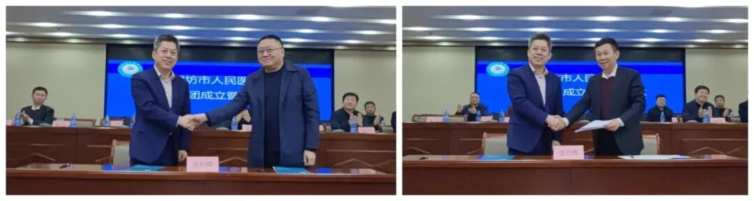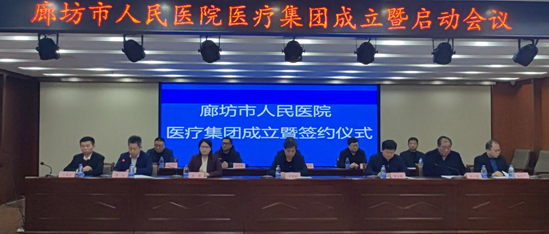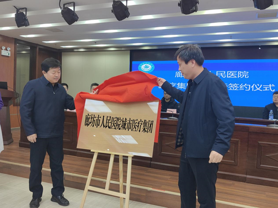 市医院院长陈光与安次区卫健局局长齐乃敬、开发区文教卫生局党委书记、局长王清达签署集团框架协议。
