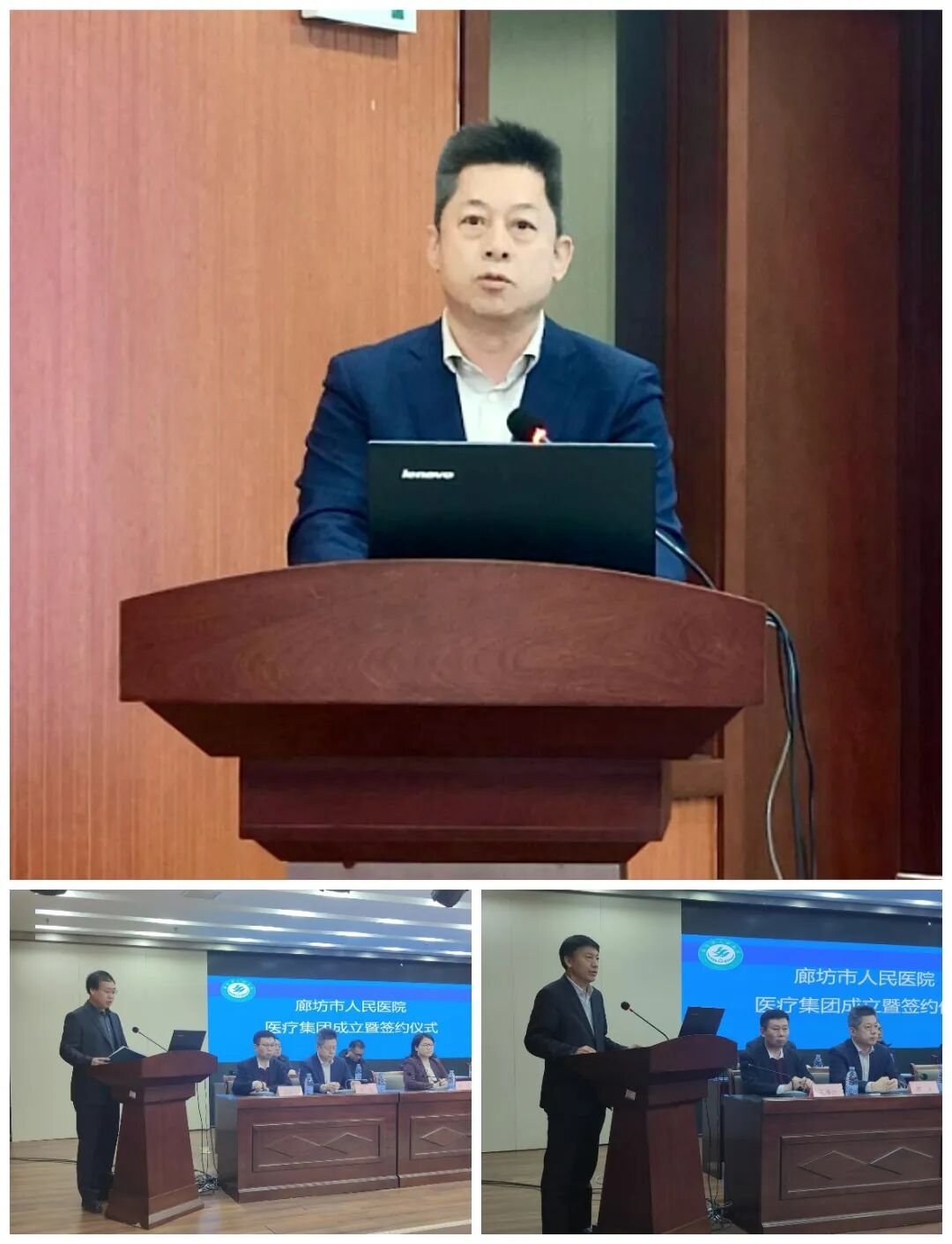 市人民医院院长陈光、安次区医院院长胡连军、开发区人民医院党支部书记祖永刚作为牵头医院和成员单位代表表态发言,一致认为各级医疗机构认真履行义务,统筹集团发展规划,充分调动各方积极性,通过优化区域医疗资源共享、落实双向转诊、打造全周期医疗服务体系,提升区域医疗服务能力,全力抓好医疗集团建设工作,努力实现集团医院的共同发展和共同繁荣,为“健康廊坊”作出应有的贡献。