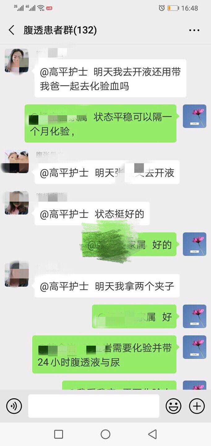为患者建立微信交流群,通过网络为居家腹透患者答疑解惑,以贴心服务与患者一起战胜病魔!