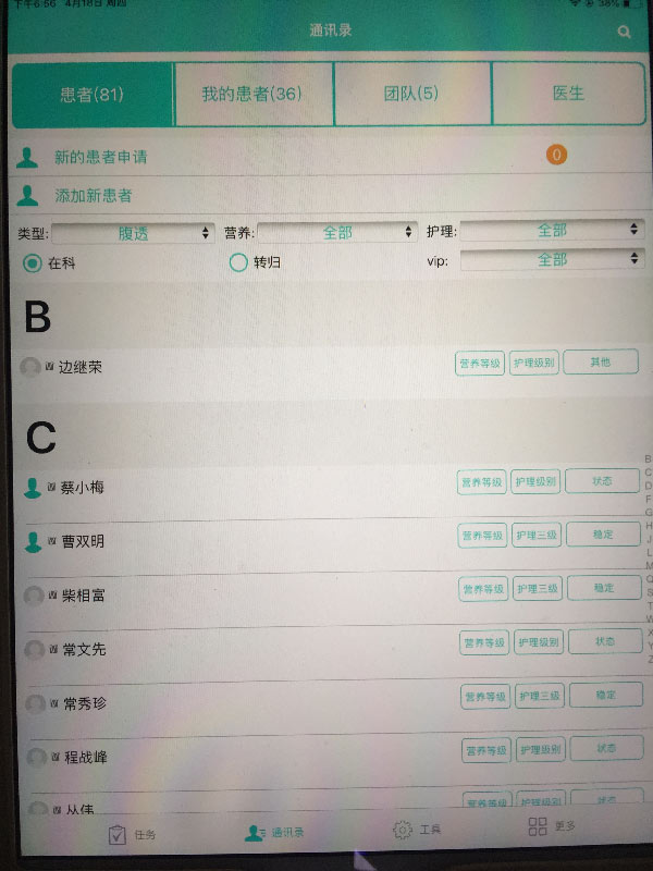 为了跟踪病人病情,所有患者均登记注册,并建立档案。详细记录每一位病人的腹透信息,目前在档病人80余人。