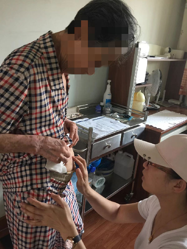 下班不下岗,可爱的身影还穿梭于病房,为腹透患者外出口换药并培训。